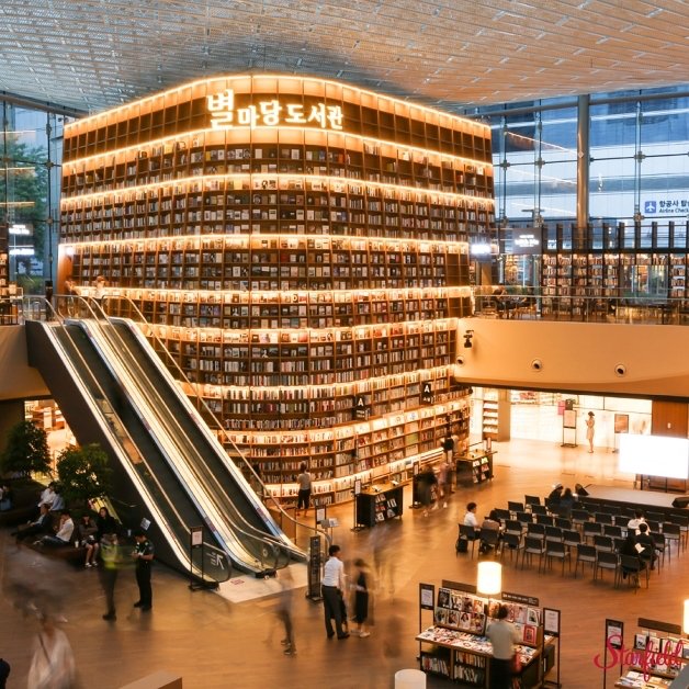 星空圖書館(별마당도서관,Starfield Library)位在百貨的中央廣場B1-1樓,佔地約850坪,藏書達50,000本,特色為以三座高達13公尺的「巨型書架」為中心環繞,被譽為「亞洲最美圖書館」,也是韓劇《青春紀錄》朴寶劍和朴素丹約會拍攝地!