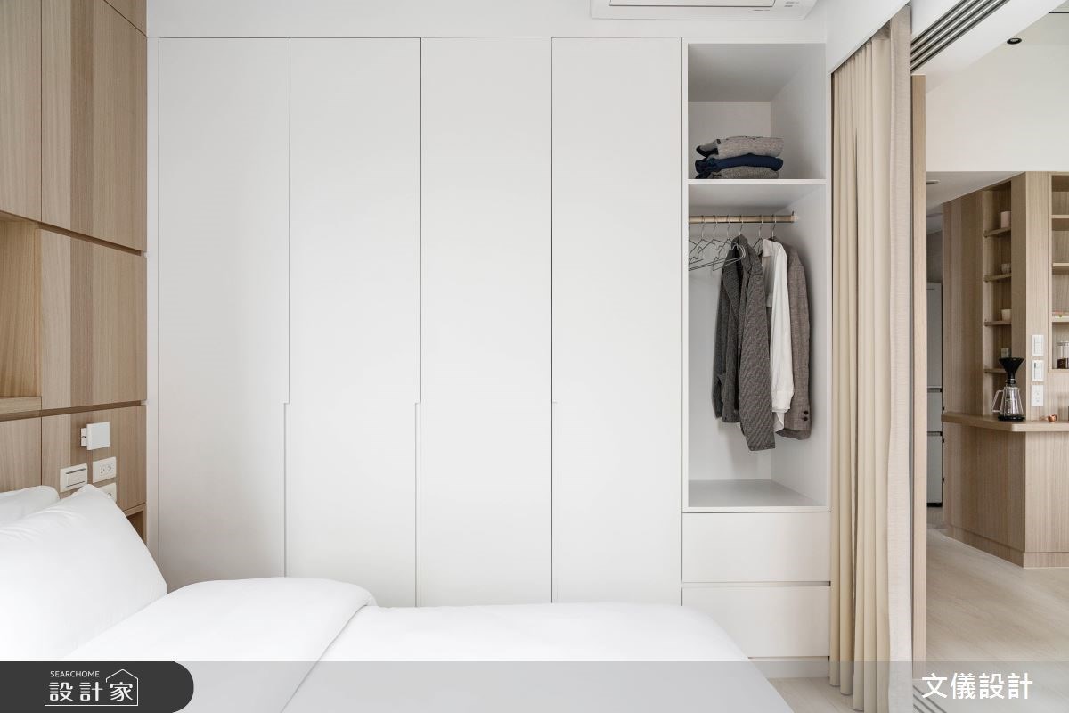 若臥室空間較小或不喜歡大型櫃體帶來的侷促感,將大型衣櫃收納以開放式設計呈現,讓空間輕盈許多,衣服一目瞭然陳列臥室中,拿取或收納效率提升不少。反之,美觀的開放衣櫃若沒有維持良好整潔習慣,反而成為臥室中的凌亂來源。喜歡開放衣櫃設計感的人,不妨參考一日衣櫃的設計巧思,利用複合設計概念將衣櫃一小部分打開,提供隨手掛放、髒衣暫留的開放區域,大容量收納則隱藏於櫃內,解決全開放設計帶來的缺陷。