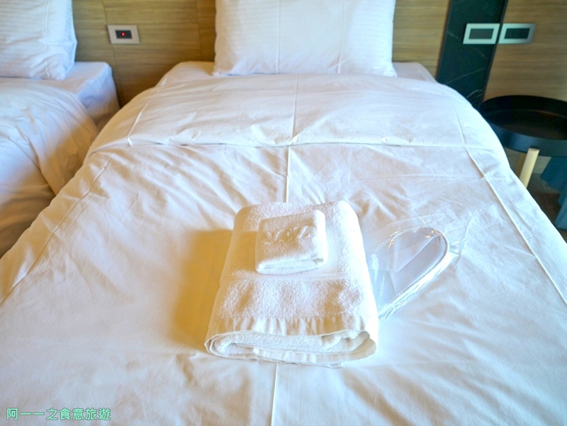 床上放有毛巾和拋棄式拖鞋,
