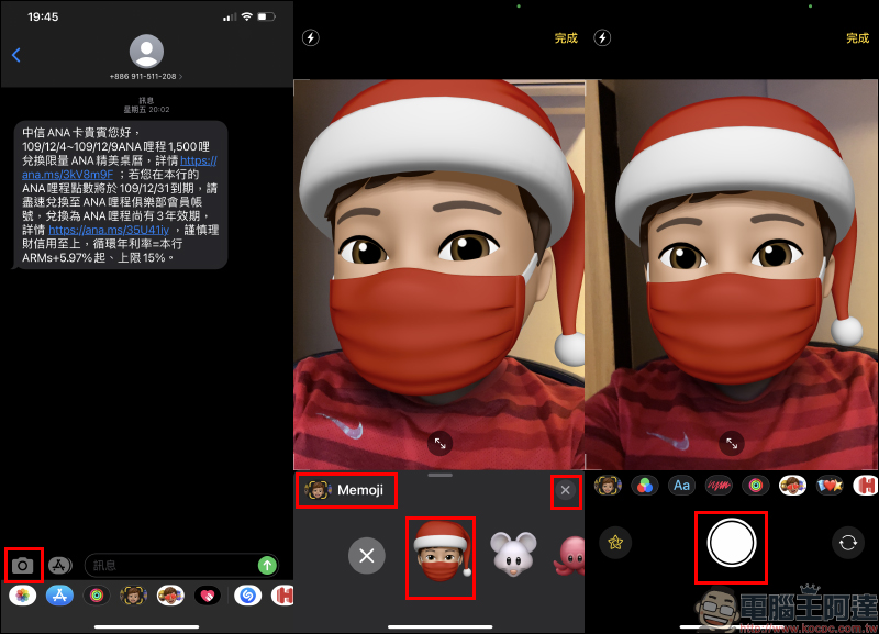 除了藉由訊息 Memoji 貼圖,如果想套用這些聖誕裝扮 Memoji 進行自拍該怎麼做呢?一樣開啟訊息 App,接著任意挑選一個有設定傳送對象的訊息,按下「相機」按鈕就能開啟相機。開啟相機後,選擇「Memoji」當畫面偵測到人臉就會自動套用 Memoji ,接著按下相機快門鍵就能進行拍攝: