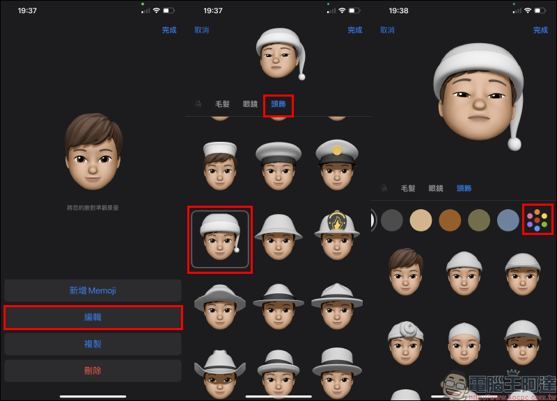 接著就能找到紅色的選項,用戶也能在這步驟微調色彩,設定完後點選畫面右上角的「完成」返回訊息頁面,就能看到各式各樣的 Memoji 貼圖表情囉!