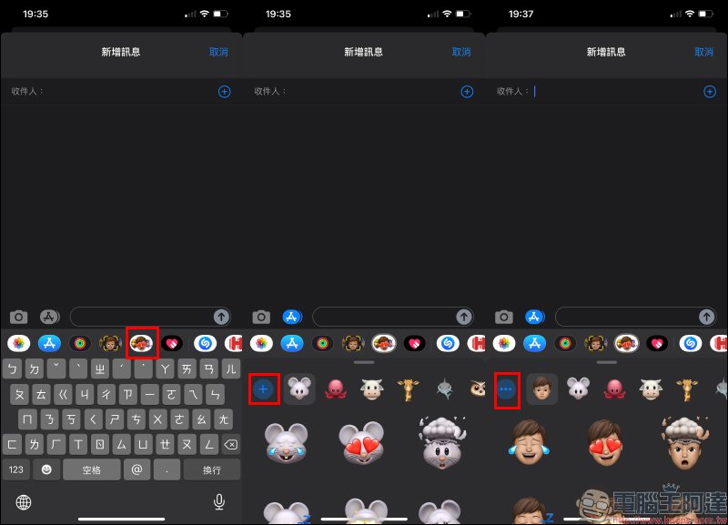 在開始玩 Memoji 聖誕裝扮之前,先來複習一下該如何使用 Memoji 吧!首先開啟 iPhone 內的「訊息」App ,接著在新增訊息點選鍵盤上方的「Memoji 貼圖」按鈕,如果未曾新增自己的 Memoji 則可點選「+」按鈕建立一個專屬的 Memoji 貼圖。製作完成後,在 Memoji 貼圖選單點選「...」按鈕進行編輯: