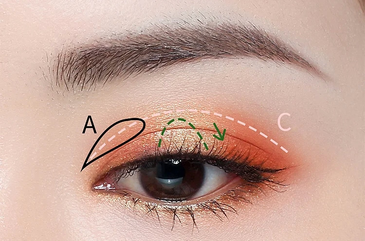 細長眼型的人比前面兩種眼型適合飽和度高的顏色,可以選擇比較亮麗、甜美的眼影色。細長眼在畫眼影時,眼影整體的形狀建議可以畫得寬、高一點,這樣能夠中和細長眼形給人的銳利感。最重要的是,細長眼一定要「畫卧蠶」!因為卧蠶的寬度也可以用來中和細長~可以用平頭刷沾取棕色眼影畫出卧蠶的陰影(D區),這樣整體眼妝就會看起來很自然!