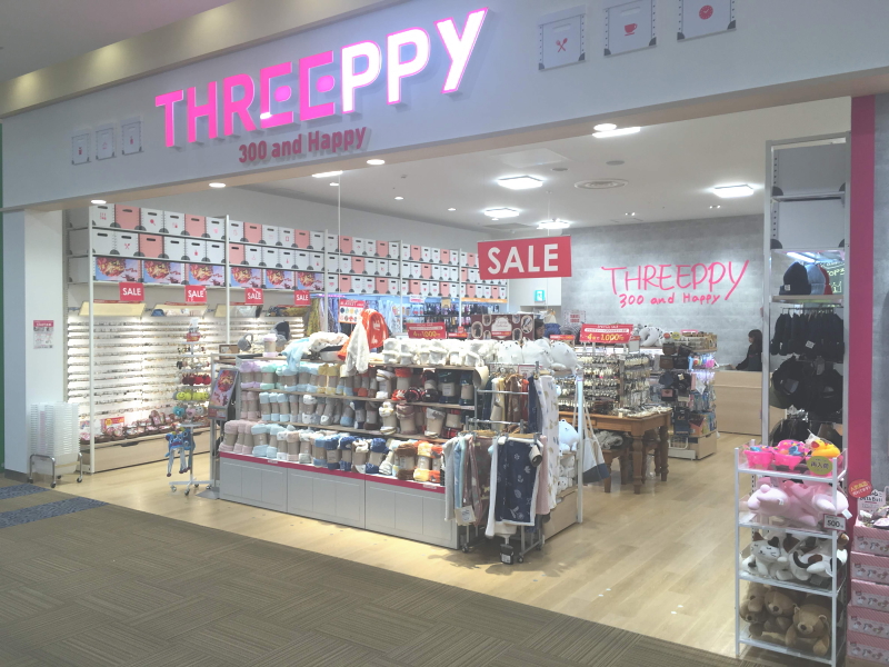 「Threeppy」的命名就是「300日圓與happy生活」於2018年正式登場,繼日本本店後Threeppy也陸續在新加波、澳門等地展店,台灣則是第三個海外聚點。台灣則以食、衣、住三搭方向發展商品,價位則由99~199都有。目前兩間門市分別位於南西旗艦店與夢時代,於12月初已正式營業,未來將有機會於台灣拓展個多店面。