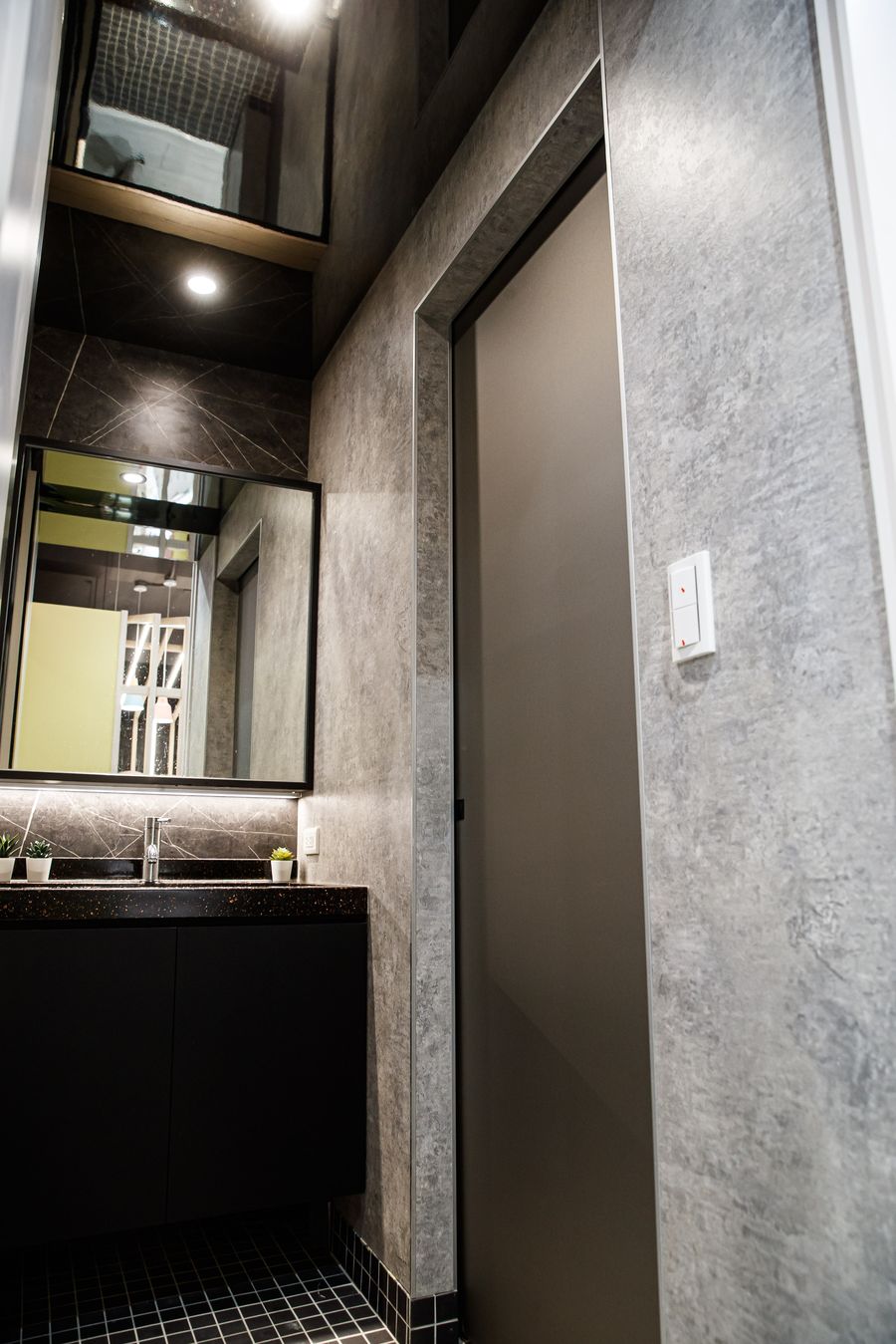 此外,廁所牆面選用火立克作為分隔牆,不僅帶有石紋質感,更重要的是無需拆除重建便可完成,讓人充分見識到富美家的產品在大幅降低施工成本與節省時間方面展現出來的絕對優勢。值得一提的是,目前裝修業法令規範日益嚴格,無論是噪音或廢棄物的處理標準都不斷提高,若富美家能夠持續增加產品系列,相信會有越來越多設計師選擇使用優質美耐板來取代隔間牆,同時打造更美好的生活品質。另一方面,美學館天花裝設鏡面,藉由反射效果達到空間延伸的作用,也是市面上的展示中心少見的有趣設計。