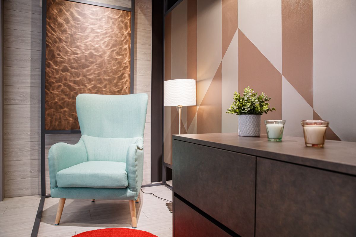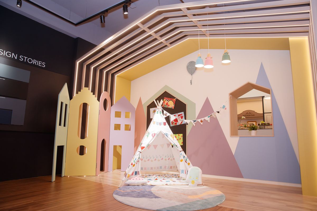 美學館內部設計客廳區、臥室區、兒童房區、廚房區,除了部分裝飾使用鐵件之外,其他包含天、地、壁都由富美家的裝飾材料組成,並採用大量FENIX板材,以強調其溫潤色調與極佳觸感,另外運用材質特性規畫空間的分類,以不同色彩與風格,例如兒童房顏色明亮繽紛、客廳色系大器沉穩、廚房色調鮮豔活潑,藉以區隔出空間各自專屬特色,讓客戶得以輕易聯想日後居家生活樣貌。而最後方兩間洽談室,以FENIX板材製作工作桌,鋪陳古典氛圍,與周邊淺色收納櫃的現代風格形成明顯對比,無形中凸顯時尚俐落且不落俗套的設計感。