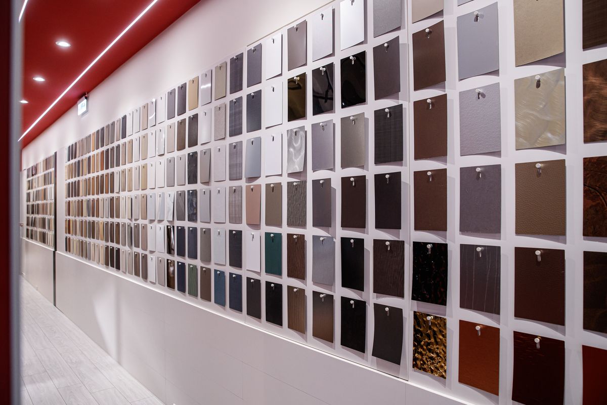 美學館入口處,便充分展現創意巧思,以視覺櫥窗的個性化空間吸引來往民眾注意力,右側則設置整面美耐板彩色視覺牆,將所有材料完整陳列出來。