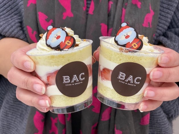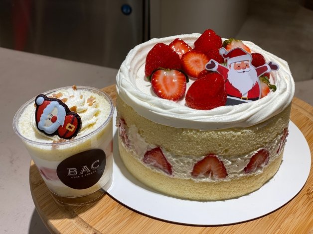 草莓香草蛋糕杯「莓好時光」台北忠孝SOGO巧克力體驗店的限定新品,是雪天使草莓香草蛋糕的縮小版,一層戚風蛋糕、一層香緹鮮奶油和草莓層層堆疊,最上面還有節慶感十足的聖誕老公公呢!