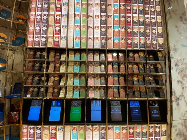 走進店面撲鼻而來的是巧克力的香甜,奢華金的色調與巧克力給人的高貴印象不謀而合,右側是開放式的櫃檯,左側是巧克力陳列,入內則有面滿滿的巧克力牆面,彷彿走進《哈利波特》的魔法世界一般神秘,Venchi巧克力總共有自選巧克力、排裝巧克力、軟心排裝巧克力、雪茄和手工巧克力五大分類!