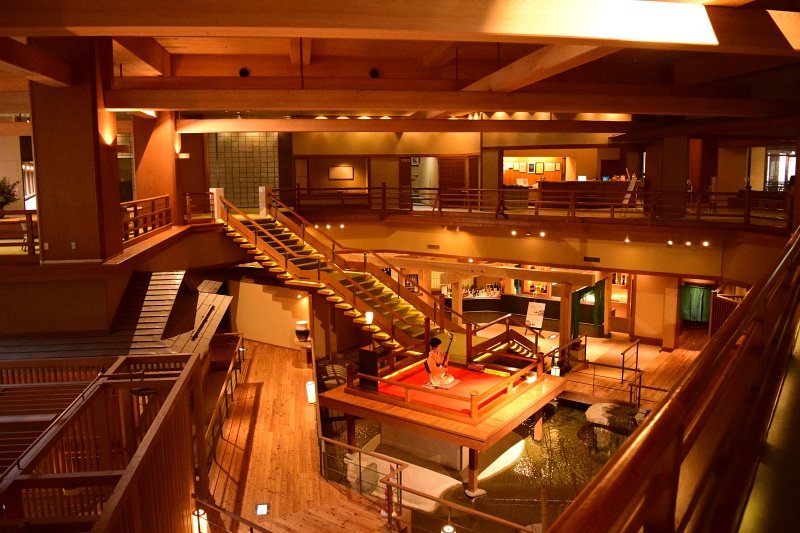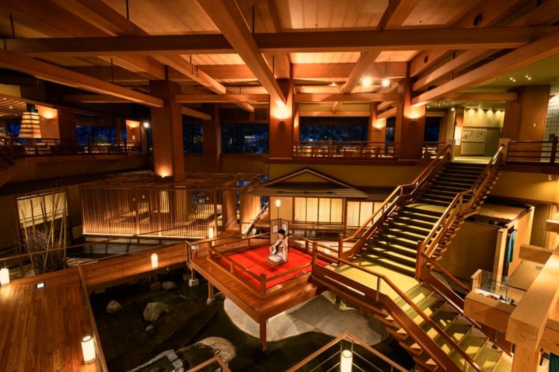 而近期因為《鬼滅之刃》熱潮,大川莊大廳的陳設再次引起話題,以錯落的階梯和日式木造建築打造而成,猛一看就和動畫中反派的據點「無限城」幾乎一模一樣,且每天的下午4點至6點,大廳的浮舞台還會有穿著和服的表演人員在該時段演奏三味琴,雖然和動漫中演奏琵琶的上弦四鳴女還是有些微不同,但氣氛的營造可說是相當完美。