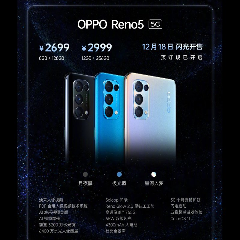 OPPO Reno5 推出兩種規格配置, 8GB+128GB 版本建議售價人民幣 2,699 元(約合新台幣 11,686 元);12GB+256GB 版本建議售價人民幣 2,999 元(約合新台幣 12,985 元)。