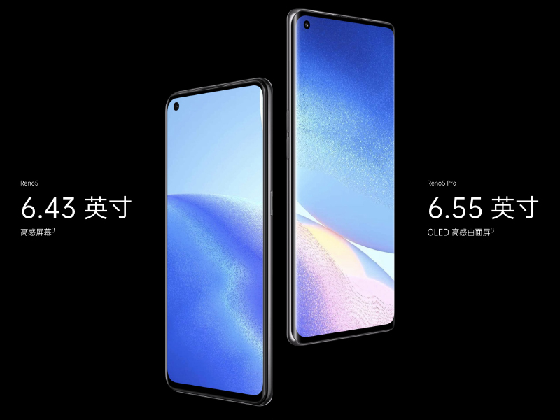 螢幕方面, OPPO Reno5 配備 6.43 吋 FHD+ 解析度 OLED 螢幕,支持 90Hz 螢幕更新率和 180Hz 觸控採樣率,局部峰值最高亮度為 750nit。 Reno5 Pro 則配備更大的 6.55 寸 FHD+ 解析度 OLED 曲面螢幕,支持 90Hz 螢幕更新率和 180Hz 觸控採樣率,局部峰值最高亮度則為 1100nit。