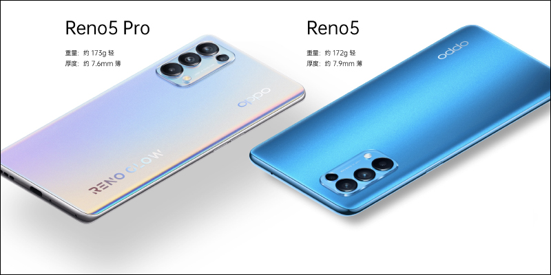 機身方面, Reno5 Pro 機身重量僅約 173g 、機身厚度也只有 7.6mm ;Reno5 標準版機身重量僅 172g 、機身厚度約 7.9mm 。即便在 OPPO Reno5 系列加大了電池容量依然維持輕薄的手感。