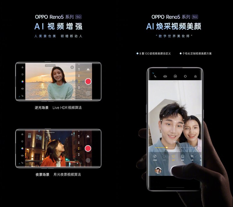 錄影功能方面, OPPO Reno5 系列將前代搭載的月光夜景影片演算法和 Live HDR 影片演算法進行融合升級,實現了 AI 影片增強效果,系統針對現場環境亮度進行判斷後,一鍵開啟 AI 影片增強模式,暗光下提升畫面亮度和細節表現,同時極為嚴格地控制噪點;逆光下有效抑制高光過曝,使畫面更自然、色彩表現更真實。