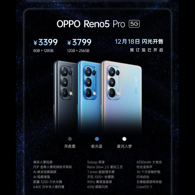 OPPO Reno5 Pro 同樣推出兩種規格配置,分別為 8GB+128GB 版本建議售價人民幣 3,399 元(約合新台幣 14,716 元);12GB+256GB 版本建議售價人民幣 3,799 元(約合新台幣 16,448 元)。