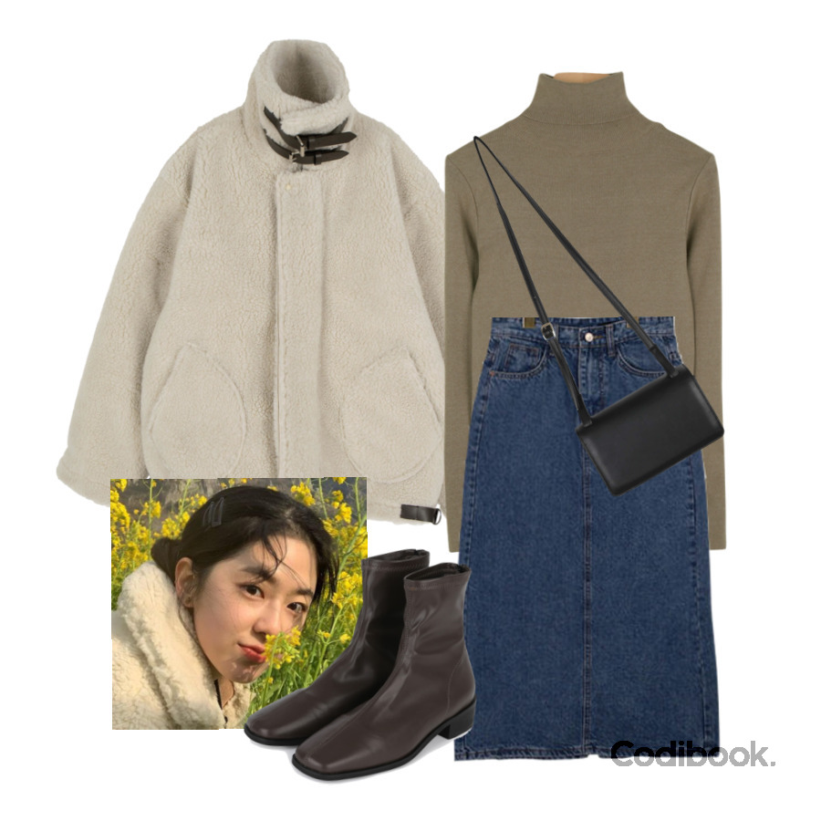 簡單休閒的高領上衣與牛仔褲,一身輕鬆舒適的穿搭在穿上黑色皮革羔羊毛外套後,顯得時髦俐落。