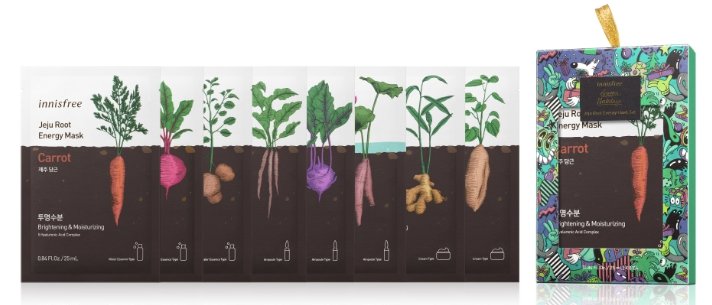 面膜根本是冬天懶人保養必備!innisfree特別精選濟州根莖植萃面膜組,一盒就能入手紅蘿蔔、甜菜根、馬鈴薯、牛蒡、蕪菁、蓮藕、薑、山藥,共有八種口味,這組也是男生、女生都OK的禮物。