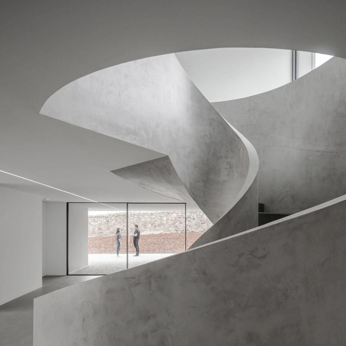 酒店四周以花崗岩牆,搭配戶外恆溫複合系統(ETICS)的灰白色面板緩緩圍塑而成。