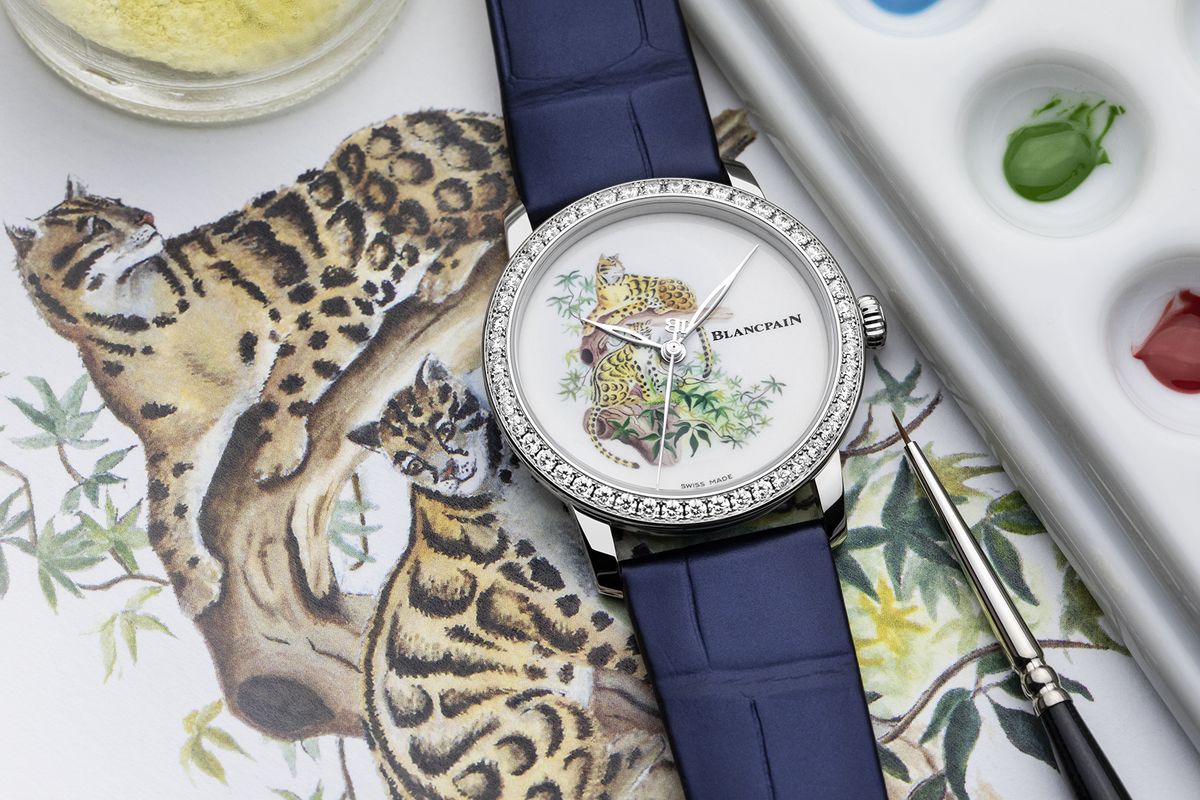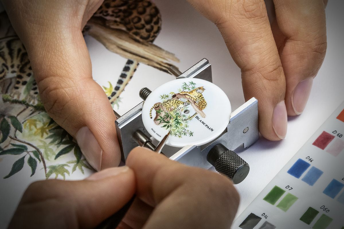 錶盤上的雲豹在工藝師的巧手下顯得生氣靈動,展現完美融合美學與工藝的感動。陶瓷上的雲豹琺瑯彩繪安置在33.2毫米的白金錶殼中並以鑲鑽錶圈環繞,搭載錶廠獨家的自動上鏈Cal.1154機芯,其一絲不茍的精密加工透過時計的鏤空錶背一覽無遺。此錶款的微繪琺瑯工藝是BLANCPAIN工藝師在Le Brassus錶廠裡進行的眾多琺瑯技術其中的一項。首先由石英、長石和高嶺土的粉末組成的陶瓷來製作彩繪錶面,一開始加水稀釋並將漿料過篩及多次過濾,去除所有殘留物和雜質,最後澆鑄在錶盤模具中。從模具脫模後乾燥24小時,再以1,000°C高溫燒製24小時讓錶盤硬化。工匠接著將琺瑯釉彩填入每個錶盤,再於1,300°C高溫下二次燒結持續24小時,使得釉彩玻璃化,形成發亮、透明並能持久穩定的錶面。接著以琺瑯粉為主的配方與松油混合,工藝師會自行製作專屬的調色盤與源自BLANCPAIN配製的特殊配方,以展現獨特細膩的色彩變化。完成繪畫後必須再次置於1,200°C的烤箱中燒製;錶盤上進行微繪琺瑯的過程十分繁複,因此,造就每個錶盤都是世界獨一的款式。