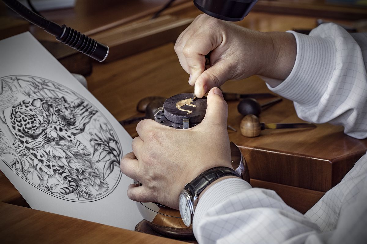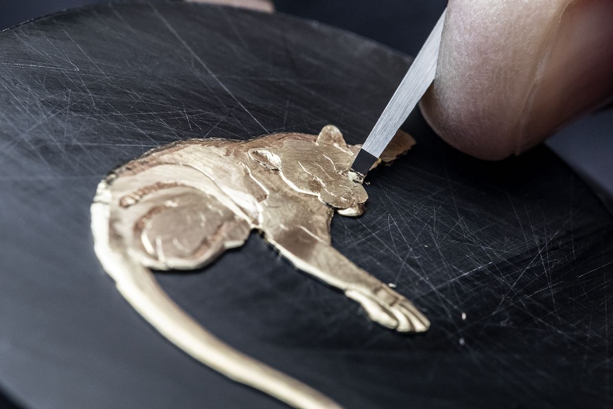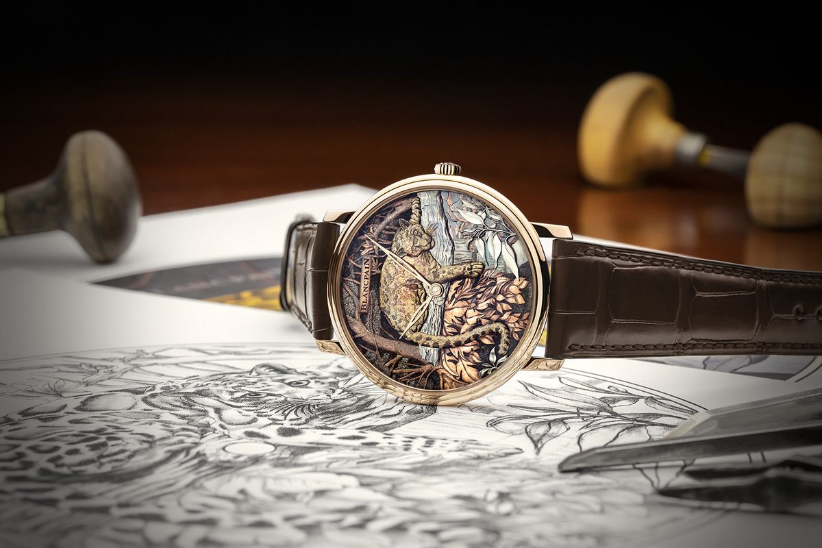 每款設計都是唯一,如同「雲豹」一般,從紙上草圖描繪背景紋飾與姿態開始,運用精密工具,以手工雕刻金色貼花將雲豹及週邊山林細節刀刀刻畫出,為了達到如雲般的豹紋色彩,以赤銅工藝黃褐色的表面展現其雲狀斑點,極其逼真。再以大馬士革鑲金工藝將黃金絲線敲打進錶盤細膩地逐一嵌入金線製成,細緻的毛髮絲絲入扣引人入勝!此款雲豹作品結合古老的大馬士革鑲金、金雕、赤銅工藝,突顯BLANCPAIN大藝術家工坊在製錶領域的獨特性,並以45毫米紅金錶殼裝載;透明背蓋以備受高裝飾性錶款青睞的藍寶石水晶製作錶底蓋。搭配15B手動上鏈機芯,上方飾有「日內瓦波紋」面盤飾紋,更顯極致藝術工藝的表現。