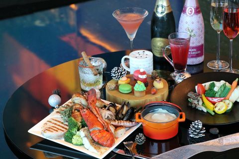 12/24至12/25晚餐餐期限定「歐風聖誕雙人套餐」,由西餐主廚特別獻上北義大利經典「皮爾蒙特溫沙拉」、超澎湃「聖誕海陸拚」,以及包含應景聖誕造型甜點的「夢幻甜心盤」等,套餐另含進口精選氣泡酒:法國安柏夫人古法釀造白中白氣泡酒或西班牙康德努巴賽隆納馬賽克限量粉紅卡瓦氣泡酒無限暢飲。