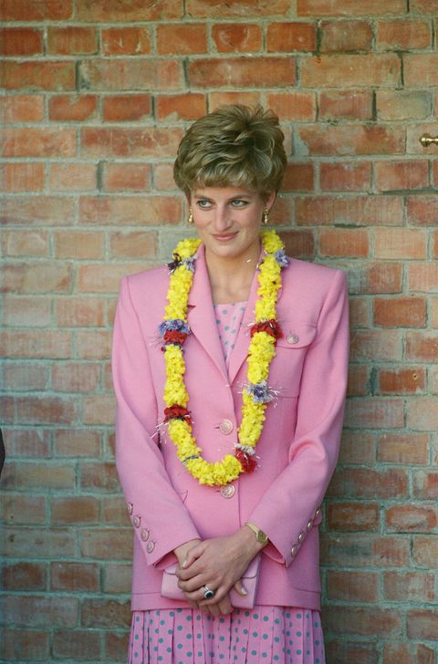 在黛安娜王妃首次的單獨出訪行程中,她選穿了一套粉紅與粉綠配色的圓點洋裝,搭配同色系的金釦西裝,鮮活的色彩與尼泊爾當地民眾獻上的花圈活潑呼應。