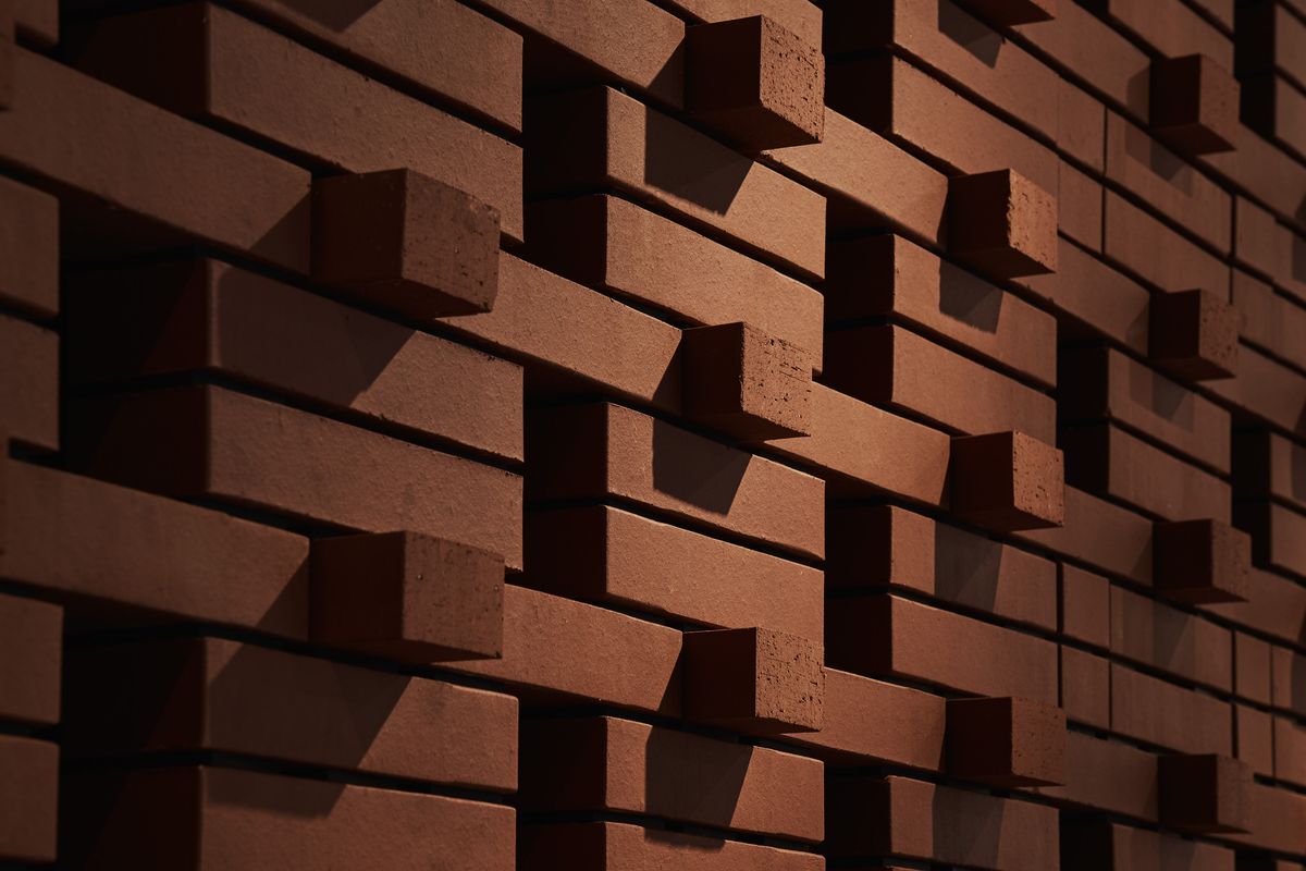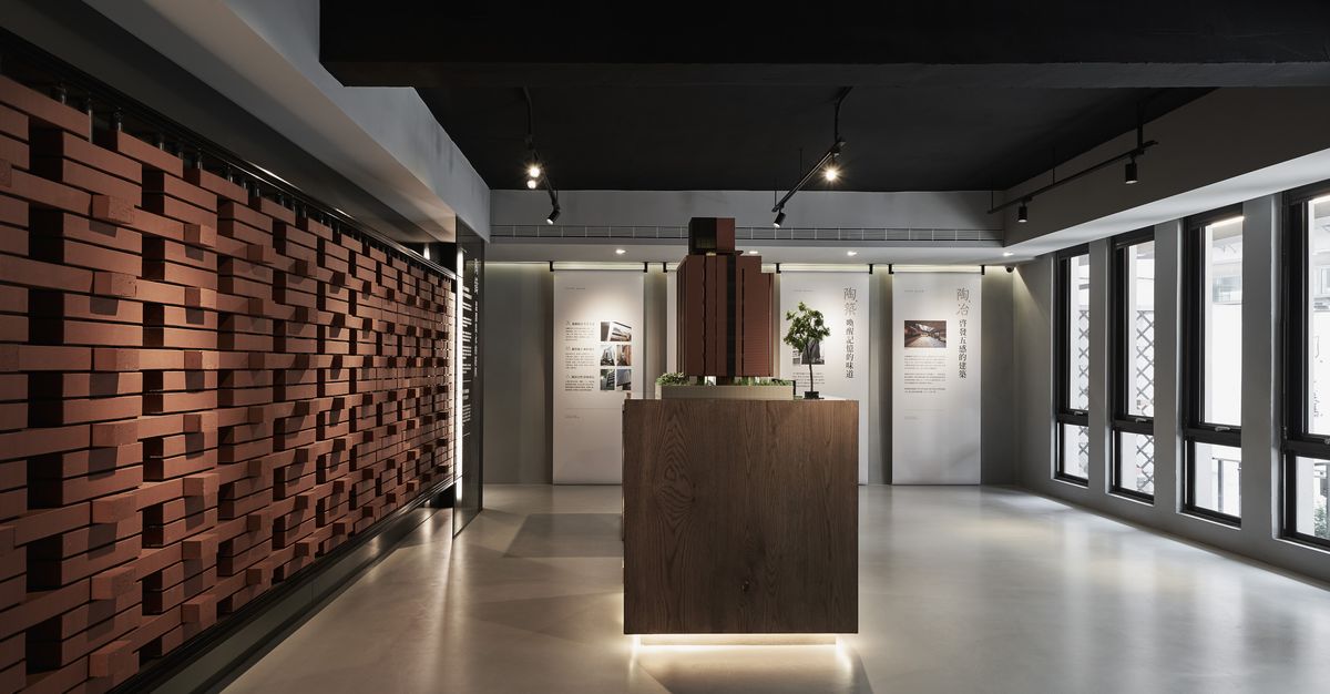 設計團隊巧妙運用建築外觀特殊的皮層設計貫穿整室空間,並植入一道吸睛展示磚牆貼合主題,圍塑成左右環繞式動線取代隔間,同時亦達到場域劃分效果,磚牆兩側分別規劃為洽談區及設備展示區。