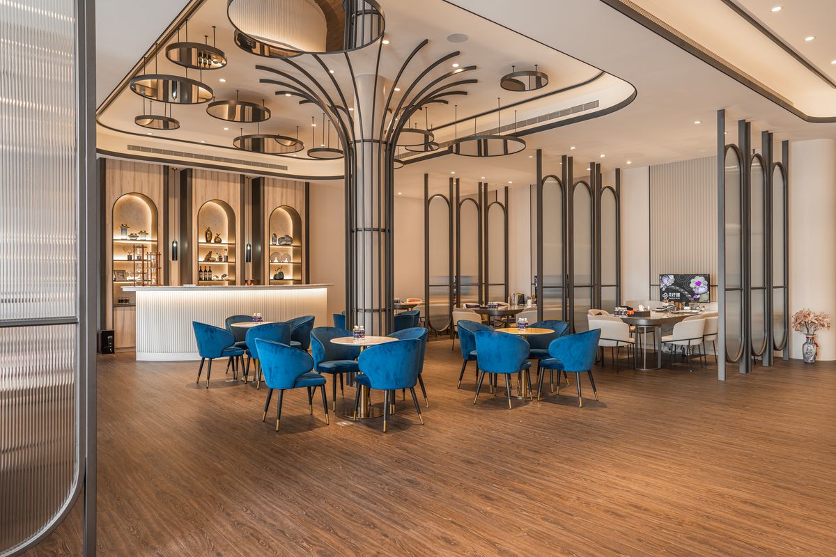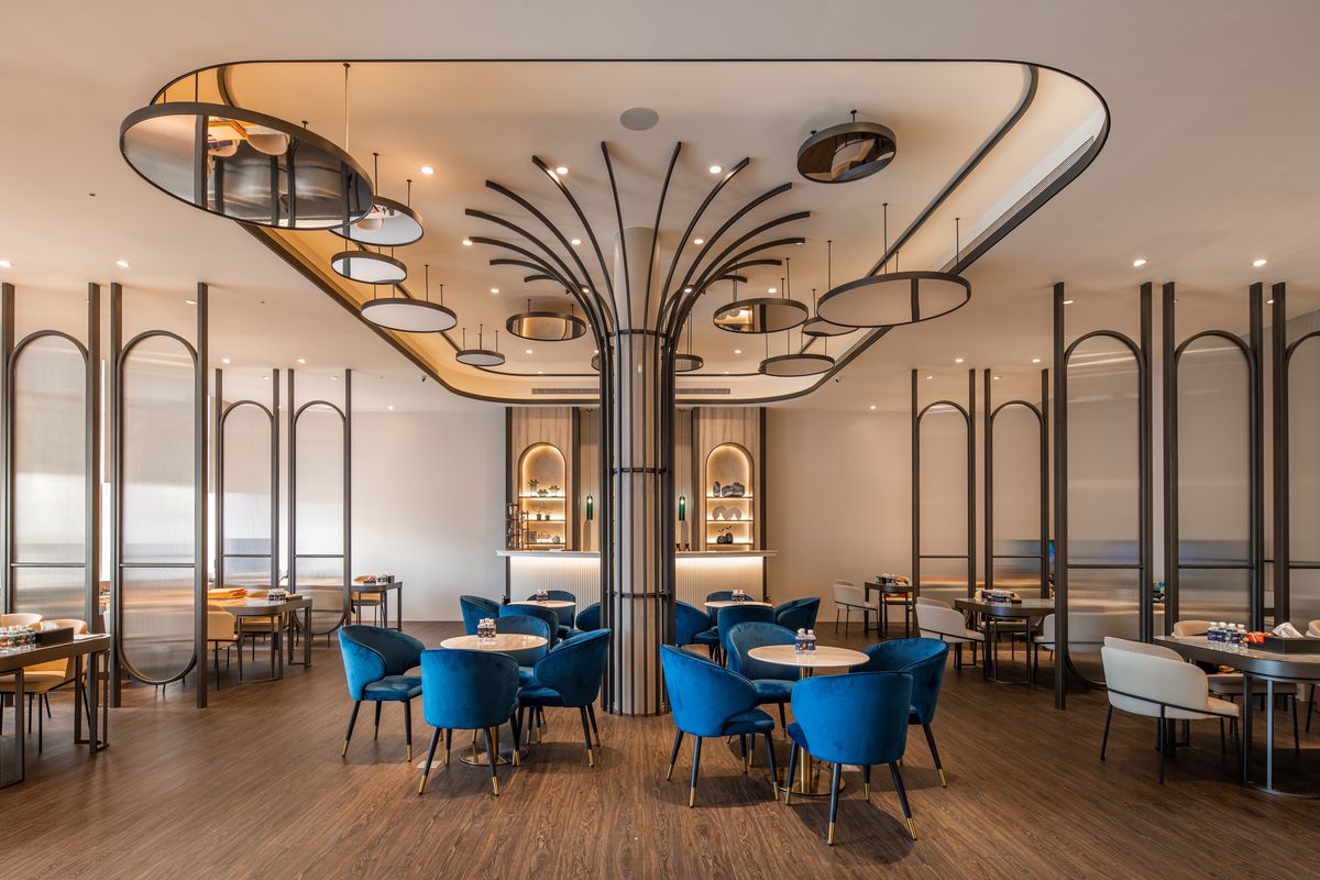 接待區中央有一根承重柱,乍看之下頗為突兀,於是設計團隊以黑色鐵件做出向外彎曲延伸的造型加以修飾,如花朵綻放的姿態有效轉移眾人注意力,同時依此為靈感核心,將圓弧語彙融入空間設計中。除了部分接待桌採用圓桌外,天花也吊掛圓形鏡面,一方面透過反射作用令空間更顯開闊,同時也與圓桌形成上下呼應的關係,視覺效果更加完整。