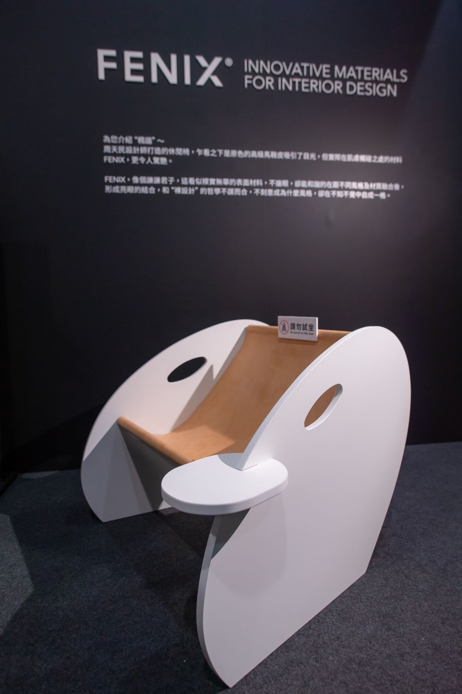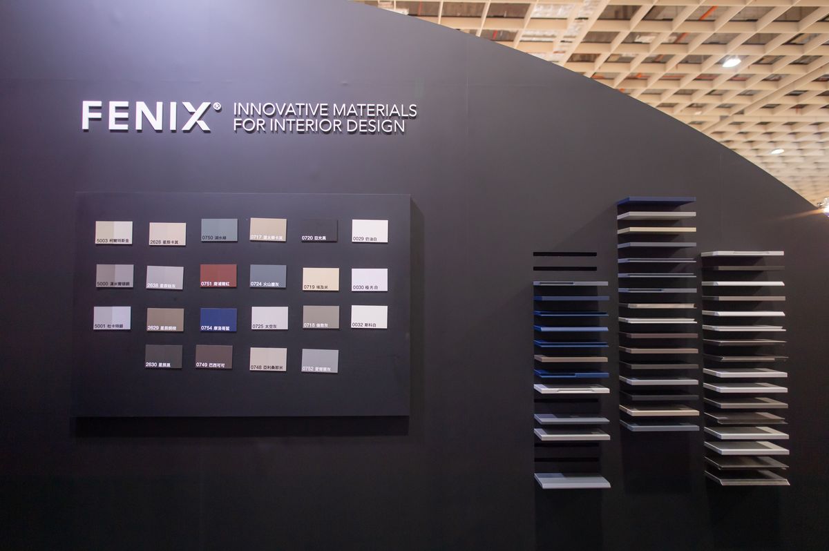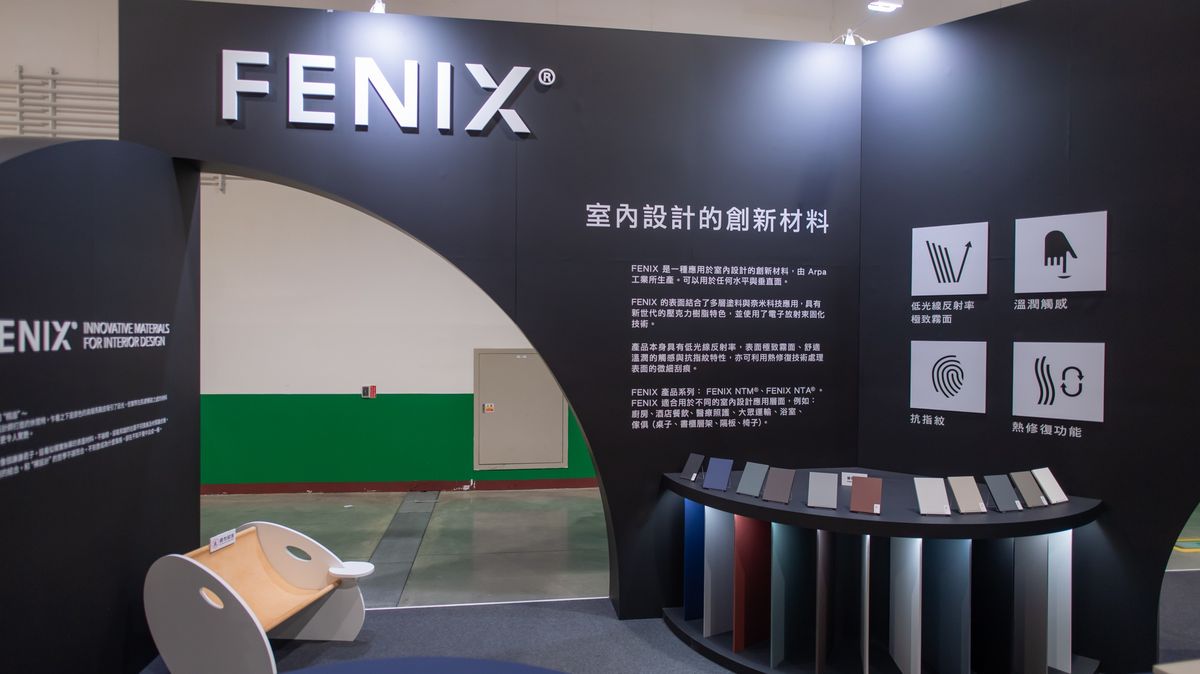 黑色區域則展示富美家旗下最新引進,由義大利進口的 FENIX奈米智慧板材。FENIX乃是目前歐洲最受歡迎且最流行的智慧板材,具備抗指紋、熱修復的獨家特性。外層表面經過新世代壓克力樹脂處理,並透過電子放射束固化技術,使其穩定。即使被麥克筆劃記,用中性清潔劑與科技海綿即可完好如新;若產生輕微刮痕,更能透過熱水復原,讓空間的美麗得以更長久地抵禦歲月侵襲。同時展區中更陳列由知名設計師周天民以 FENIX 為基材獨家創作的休閒椅,充分顯示 FENIX一物多用的豐富變化可能性,而這樣的新產品也極有可能改變未來空間規劃的型態,讓普羅大眾以更合理的價格享有更高的生活品質,關於設計,從此迎來不一樣的嶄新面貌!