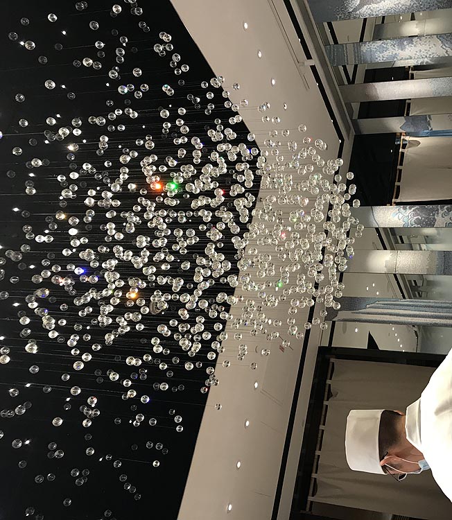 「鮨增田」增田主廚為全心投注台北餐廳的開幕,毅然決然於去年9月結束東京本店,並將本店的日籍廚藝團隊移師台北,把已連續3年榮獲米其林二星殊榮的星級美食完整複刻在台北。強調「全感官體驗」的「鮨增田 台北」,空間由日本著名橋本夕紀夫團隊設計,餐廳內引人注目的華麗水晶燈,高低排列、營造出海中的氣泡由下往上湧出的意境,給人無限想像。
