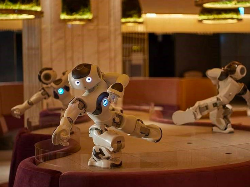 在每一張桌邊都會有 Pepper 提供點餐與聊天服務來炒熱氣氛;可雙腳行走的機器人 NAO 在店內以舞蹈娛樂來賓;店內環景的清潔與消毒則由 Whiz 機器人來負責。