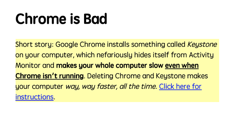 雖說這次被爆出的「壞」,據稱也是行之有年 -- 其實早在 2009 年就被媒體爆料,Google 所開發的神秘 Keystone 元件在 Mac 電腦裡執行了很多「怪怪的事」,所以並不算是什麼新聞。但說到為什麼最近很多人都突然想要抵制 Google Chrome 的話,就得多虧一位神人開發者所製作的「Chrome is Bad」頁面的宣傳了。繼續閱讀好用的 Chrome 為何炎上被抵制?因為有人認為「它壞壞」還做了懶人包報導內文。