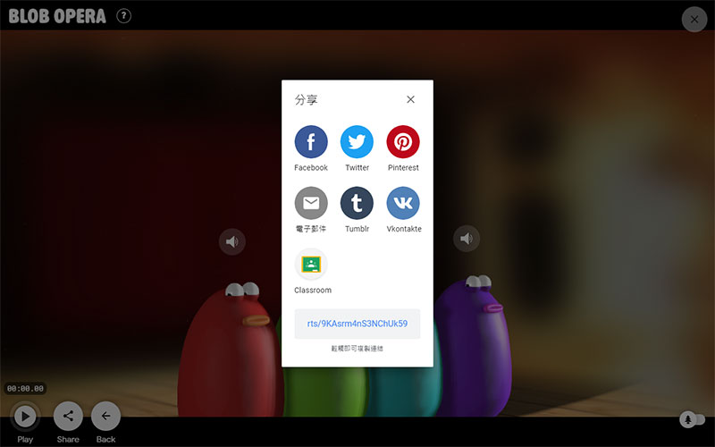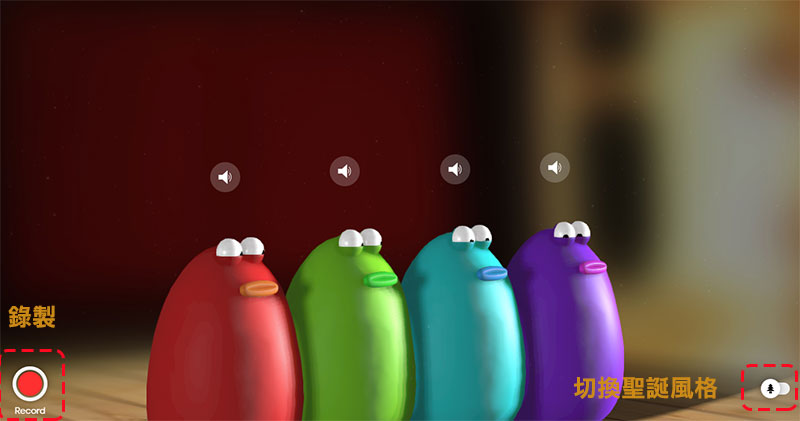 在正式開始的介面上,左下角可以看到錄製按鈕,右下角則是是否切換聖誕風格。錄製後的影片可以分享到社群平台,或是直接複製連結傳送給朋友;而切換聖誕風格後,四個角色會戴上應景聖誕帽,背景也會飄起雪花來。如果點擊單一角色頭上的喇叭圖示,則可讓該角色靜音不唱,或是繼續唱出聲來。