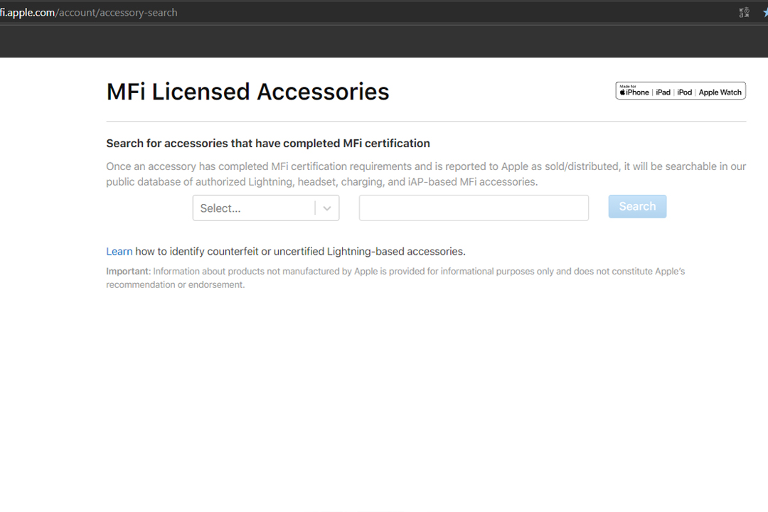 MFi 認證查品可以透過新版的 MFi 資料庫 https://mfi.apple.com/account/accessory-search ,來查詢,無論透過型號、品牌、條碼,任何一個條件都能搜尋。但由於生產配件的廠商、品牌眾多,資料庫原則上是以季為頻率更新,因此有可能會有新上市的產品,短時間還找不到資料的情況發生,這時候消費者還有下一個方法可以做為驗證。