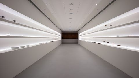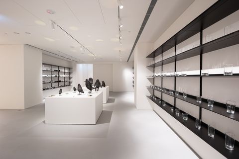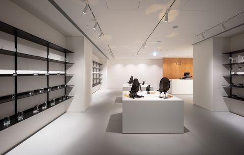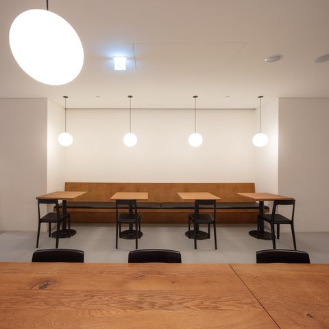 旗艦店除了陳列玻璃美物,還以巧妙的牆面設計將空間分為品牌空間及餐飲空間,品嚐咖啡美食的空間以木質調為裝潢,看起來簡單卻不失格調。值得一提的是,餐飲空間還組合了多個他為多家國際品牌設計的作品,像是他為家具品牌Maruni設計的餐椅(Hiroshima)以及他為Panasonic 設計的圓形吊燈(Modify),另外所有展示用的玻璃杯層架都是他為日本SUS Cooperation 設計的全鋁製展示架。