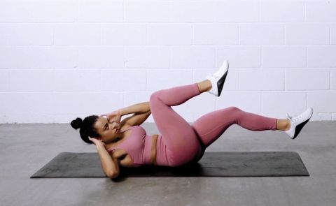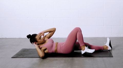 (a) 背朝下平躺、雙腿伸展。手肘彎曲、手放耳朵後方。抬起雙腿、頭和肩膀離開瑜珈墊。