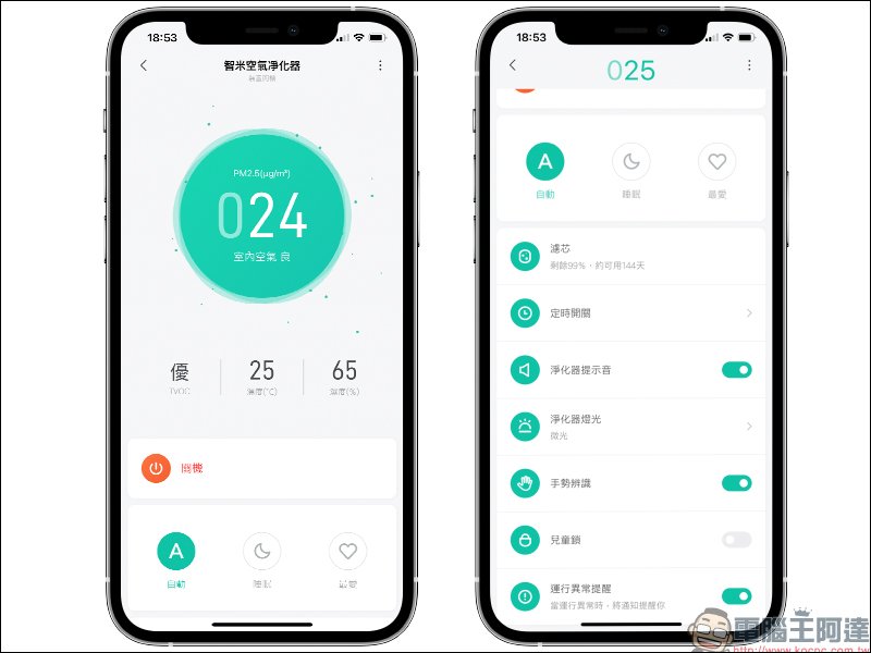 此外,米家 App 還能設定定時開關、提示音、 OLED 螢幕燈光、手勢辨識、兒童鎖等設定,濾芯的使用壽命和預估天數也能在 App 檢視。