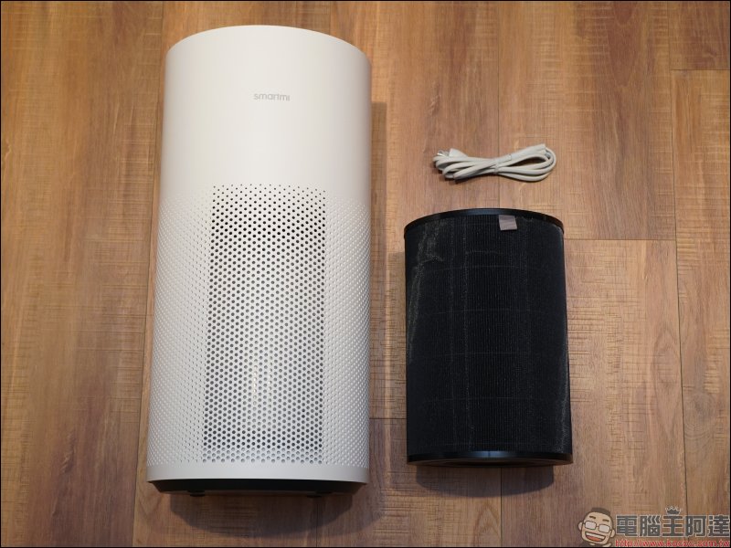 智米空氣清淨機的內容物如下,包括智米空氣清淨機、濾芯以及電源線: