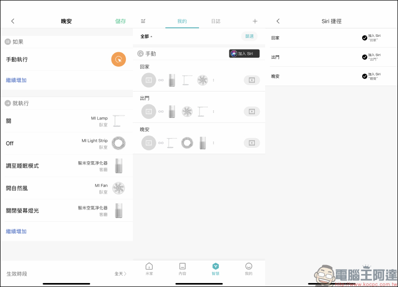 如果想讓聲控操作更「進階」, iOS 用戶就能使用米家 App 早已支援的 Siri 捷徑功能,只需先在米家 App 設定自動化操作流程並將他加入 Siri 捷徑腳本後,即可透過Siri 語音就能控制智米空氣清淨機。