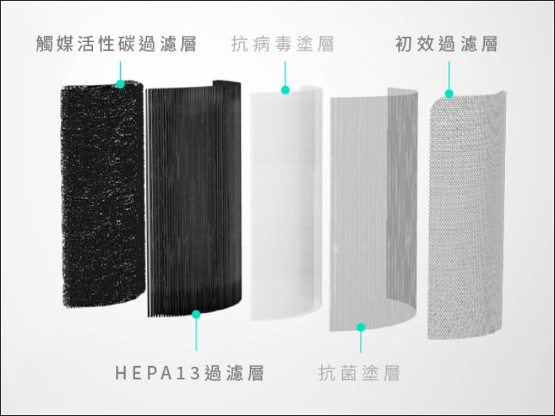 第一層的「初效濾網」可捕捉毛髮、灰塵等大顆粒物質,搭配抗病毒塗層 >99.99% 抗病毒率、抗菌塗層 >99.99% 抗菌率;第二層的「HEPA 13 濾網」能過濾 PM2.5 、花粉、二手菸甚至小至 PM0.3 的超微粒也能達到 99.9% 以上的淨化能力;「活性碳濾網」則能吸附並有效去除甲醛、甲苯、工業廢氣等常見室內有害氣體與異味。