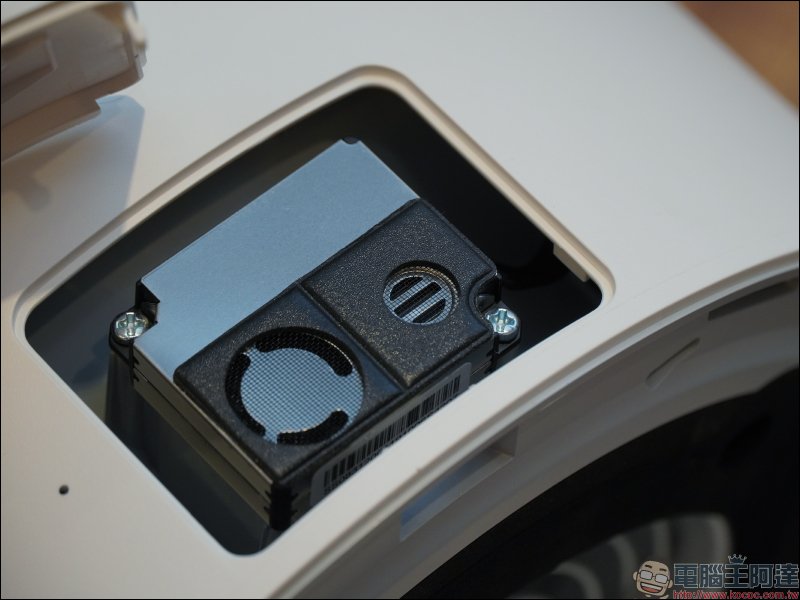 接著看到機身背面,由上至下依序為螢幕燈光切換的實體鍵、 VOC 感測器、雷射 PM2.5 感測器以及濾芯艙: