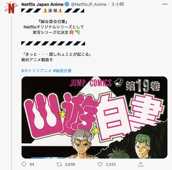 Netflix Japen Anime的官方推特帳號,在12月16日上午公布了Netflix確定製作《幽遊白書》真人版系列的消息,引發網友的一陣熱議!