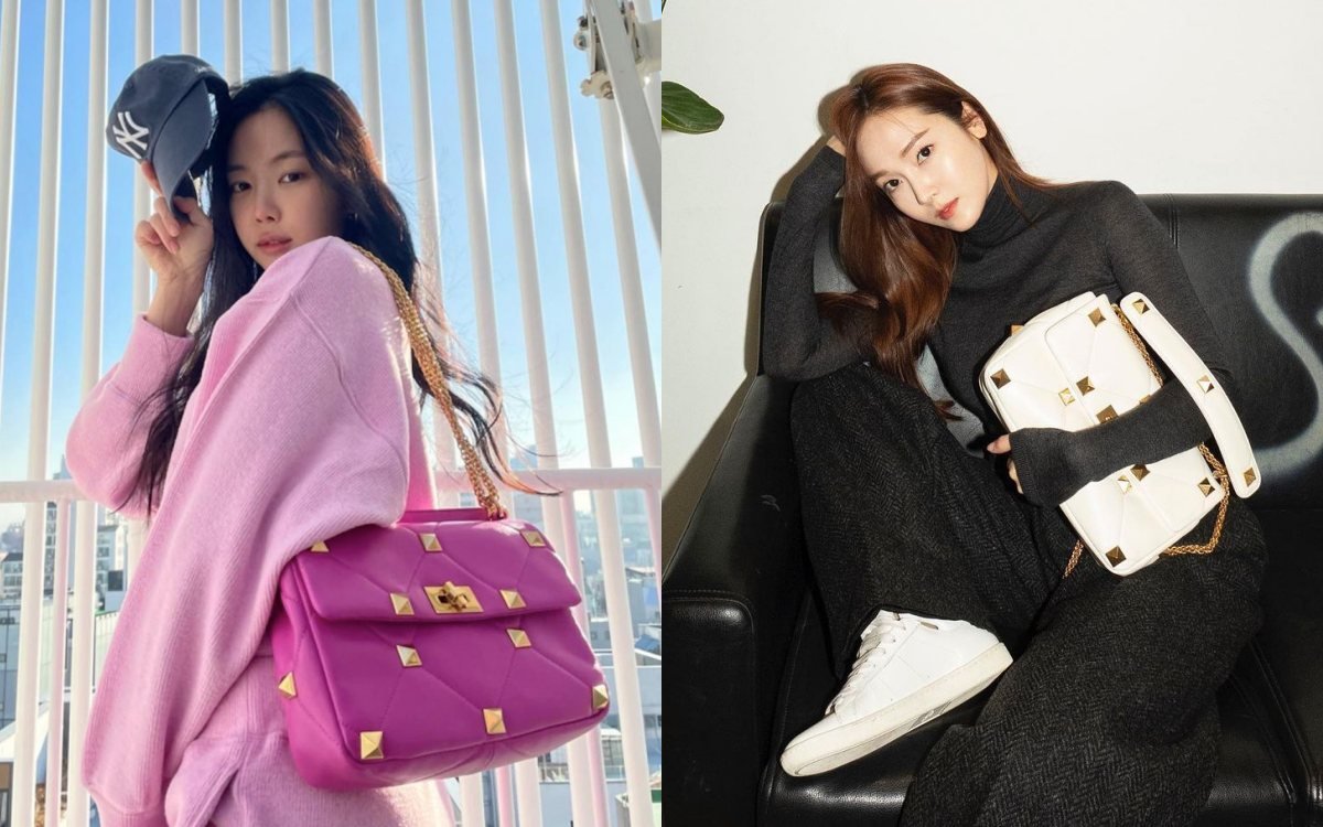 Apink成員娜恩選擇了非常有少女感的桃紅色包款,搭配身上穿的淡粉色上衣,One Tone的搭配超可愛;Jessica則是挑選了最百搭的白色包款+金色鉚釘的款式,讓包款的優雅氣質也加了一點率性!不知道妞妞們有沒有發現,因為近期一直有將包款上Logo放大的設計,所以這款「Roman Stud」包包上的鉚釘也比起過去來的放大許多。