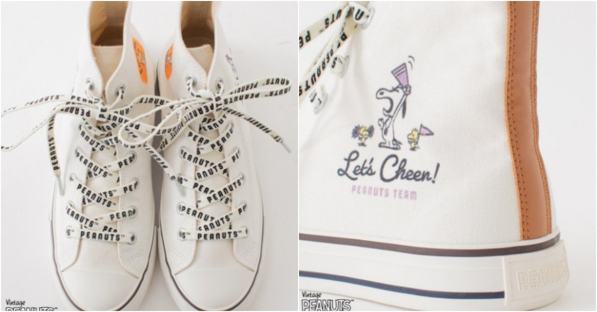 「加油!加油!加油!」有沒有感受到史努比與好友糊塗塌客的賣力打氣(笑)?他們可愛又拼命的應援模樣,實錄印在白色高筒帆布鞋側邊,甚至有一隻走散的糊塗塌客藏在鞋內持續加油,鞋身後方拼接大地色異材質,鞋帶部分也是亮點,滿滿的PEANUTS字母印上,哪來的小白鞋這麼時髦?
