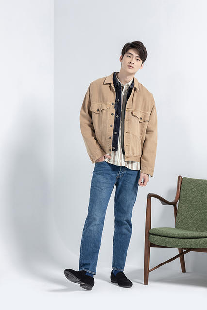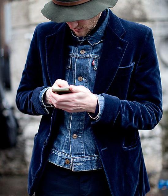 牛仔外套不僅能夠當作外衣,同時也具有襯衫的版型,只要扣上扣子,就成了最好內搭單品,如同三件式西裝的背心,為紳裝創造豐富的層次感。下圖的型男用同色系的搭配手法,將天鵝絨西裝外套混搭單寧襯衫,不僅具有「整體感」,異材質的碰撞更蘊含穿搭巧思。