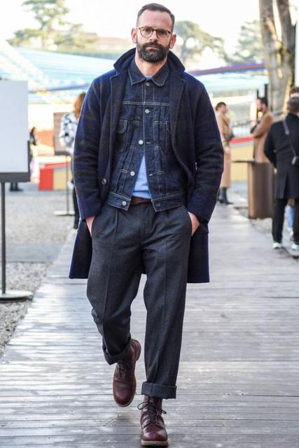 在大衣裡加上一件牛仔襯衫,並將扣子全部敞開,走在街上就會有種飄逸的感覺,除了海軍藍大衣搭配單寧外套的同色系穿搭,還可以嘗試大膽的撞色風格,利用芥末黃、橘紅色或格紋圖案的大衣,與藍色的牛仔外套形成對比,營造鮮明的個人風格,強大的氣場任誰也無法忽視!
