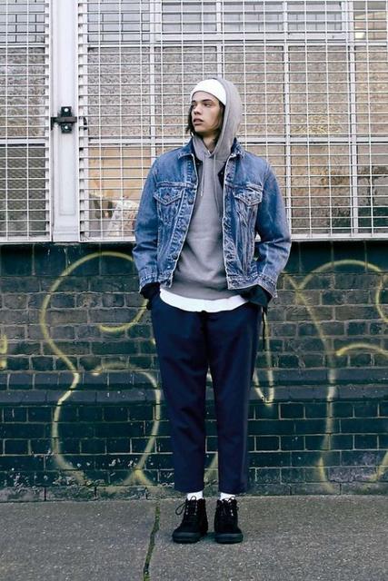 當天氣轉涼之後,單薄的白T無法抵禦寒冷,這時就輪到帽T上場了。「牛仔外套x帽T」的穿搭方式同樣非常基本,甚至不太需要考慮花色或版型的問題,只要將兩樣單品搭在一起,簡單就能營造街頭潮流氛圍,是歐美相當常見的打扮。