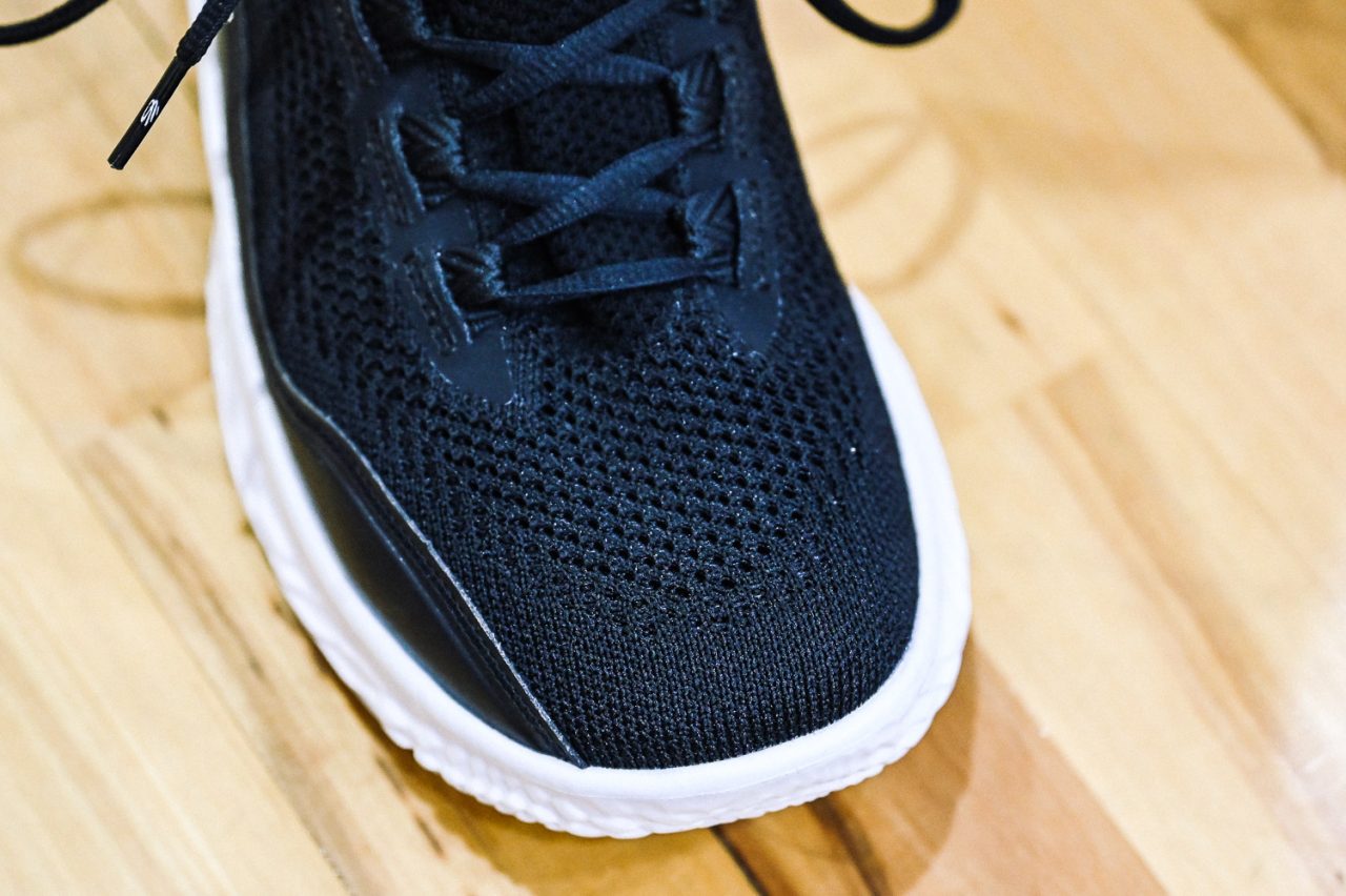 如果真的真的沒辦法試穿就要買,我會建議選原尺寸。雖然以我的腳型來說 Curry Flow 8 楦頭稍寬,大拇趾跟小趾還可以往兩側舒展的那種,造成某些急停後折返、步伐變向轉移時,腳掌會出現些微滑動導致大拇趾有磨擦不適感,但 Curry Flow 8 鞋頭前緣面料有一圈加強處理,針織面料密度高也較無延展性,小半號的話腳趾變成頻頻頂著鞋頭那更痛,權衡之下覺得還是原尺寸適宜,多套一雙薄襪有讓大拇趾滑動情況改善不少,對我而言包覆感是達最佳狀態,或者更換摩擦係數高的防滑鞋墊應該也行得通。