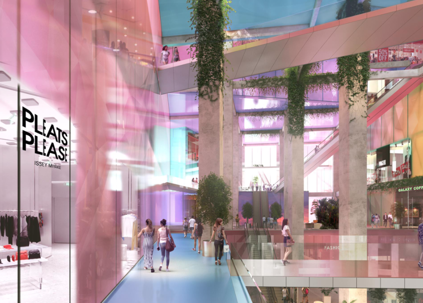 挑高的空間的設計讓在裡頭逛街的人視野顯得不那麼壓迫,垂懸高掛著植物點綴與灰白色的石柱矗立,《MVRDV》建築團隊特意在樓層配色上挑選粉、紫、淡橘色的玻璃窗,讓透進的陽光呈現不那麼尖銳。
