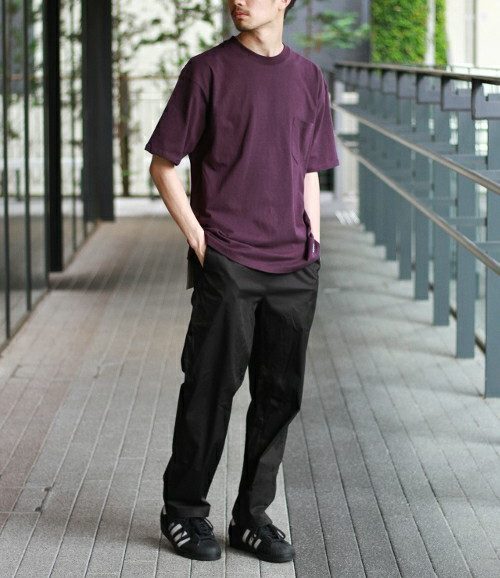 酒紅色的 T-shirt 往往一件穿上便十分有造型,擔心不好駕馭的話,選擇黑褲一同穿搭肯定是不會失誤的組合!不僅能將造型重點放在酒紅色 T-shirt 上,藉由黑褲與黑鞋來收尾,更給人一股沈穩的印象。